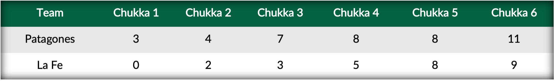 Utilizing their recent championship experience, brothers Benjamin and Joaquin Avendano combined for four goals in the first half to give Patagones an early lead, while Tomas Garcia del Rio continued his strong penalty shooting on the season to finish a perfect 5 for 5 in the game. A determined La Fe completed the second half comeback with Lucas Escobar and Francisco Elizalde leading the charge, however, Patagones excelled in the sixth chukker, adding two penalty goals and field goal to secure the 11-9 victory.