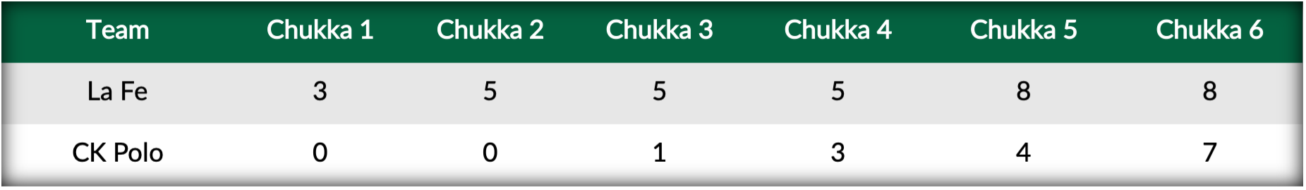 Unable to score since the second chukker, a dry La Fe offense came to life off the mallet of Lucas Escobar, followed by consecutive goals from Robi Bilbao and Elizalde to restore a four-goal advantage. Attempting to keep CK Polo’s chances alive, Keko Magrini sank his second penalty shot of the day, while teammates Joaquin Panelo and Facha Valent followed up with field goals of their own. Running out of time, La Fe’s ability to keep goal leader Keko Magrini tied up for the majority of the game saw their early start and accuracy from the field carry them to an 8-7 win.