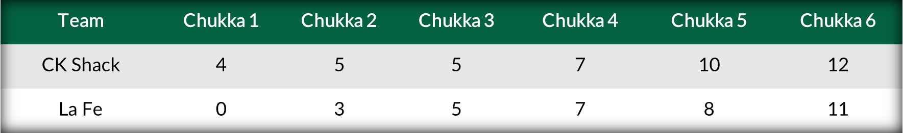 Two quick fouls to begin the game for La Fe sent CK Shack to the penalty line where Joaquin Panelo opened the scoring on a Penalty 4 conversion. Quickly followed by a field goal and two more penalty conversions from Keko Magrini, CK Shack found themselves ahead 4-0 and holding a commanding lead at the end of the first chukker. Undeterred, La Fe reorganized and turned to Elizalde, who produced three goals in the second chukker to cut the deficit in half. After the flurry of penalty goals in the opening chukker, CK Shack was held to just one field goal for the remainder of the half allowing La Fe to quickly erase their lead and pull even at 5-5 entering halftime, receiving field goals from Elizalde and Robi Bilbao.